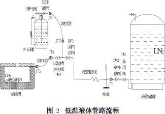 3、液氮管路流程。液氮管路流程用于向试验装置加注低温液体冷却剂液氮,其流程如图2所示。