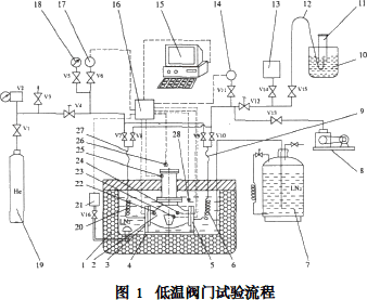 当前,随着石油化工和燃气行业的迅速发展,尤其是液化天然气(LNG)作为一种新兴能源的迅速崛起,超低温液化天然气(LNG)调节阀(工作温度为-196℃)的需求量猛增。为了对阀门在超低温工况的使用性能进行测试,提高LNG阀门的产品质量,研制了LNG阀门模拟工况试验装置(以下简称低温阀门试验装置),该试验装置采用微机自动控温系统进行低温压力试验和泄漏量检测。