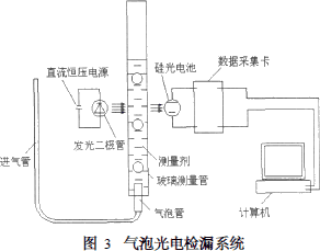 测试系统的台架总体结构,包括仪表面板(垂直面)、阀门面板(倾斜面)、仪器架和气泡光电检漏系统等部分。仪表面板上包含电源开关/指示器、指针式精密压力表、数字式压力表、温度数显仪和试验时间计时器等。气泡光电检漏系统的原理性示意图如图3所示。