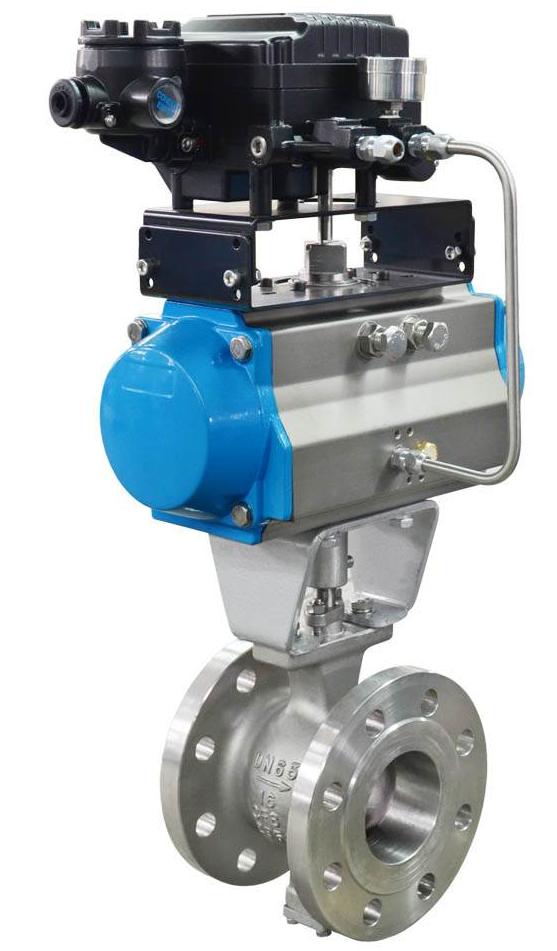 V型调节球阀,采用特殊设计的球面上等百分比V形切口形式,使其不仅具有较大的可调比,同时还确保了良好的调节性。由于阀芯在动作过程中,球面上的V形切口与阀座之间可形成有效的剪切作用,加上直通式的流道结构,十分适合于对纤维介质、浆料、粉末以及其它流体、气体和蒸气的控制。