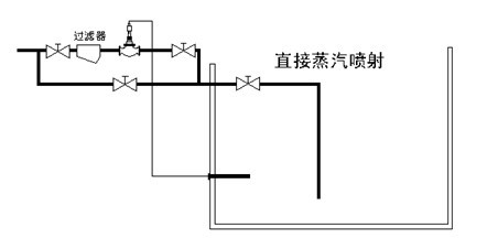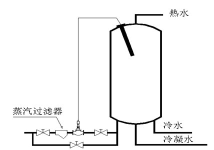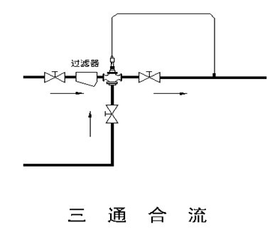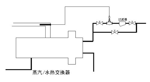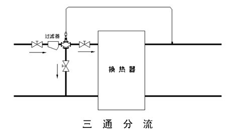 2.       阀体安装前应清洗管道,不得有杂物。阀体安装时必须垂直于地面,阀体进口方向与热媒介质流动方向一致。本温度调节阀前后应安装截止阀且调节阀前应安装过滤器,以免杂质损伤密封表面。为方便用户的使用及调节阀的检修,应设置旁通管路并安装截止阀,请参看示意图。