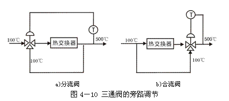 三通调节阀常用于热交换器的旁路调节,也可用于简单的配比调节。旁通调节是调节热交换器的旁通量来控制其出口流体的温度。如图4-10所示,三通调节阀装在旁路的入口为分流,装在旁路的出口为合流。合流调节阀流通能力较分流调节阀大,调节灵敏,但应注意温差对调节阀的影响。 由图4-11可见,比起二个二通调节阀的旁路调节,用三通调节阀旁路调节可以省掉一个二通调节阀和一个三通接管,不但费用省,而且占地小,因此得到了广泛应用。