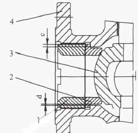 (1)阀座(图3)采用浮动设计,降低加工难度,保证阀座中心线与半球体球面中心点重合,从而提高密封性能。阀座与阀体有间隙d,装配时利用半球体定位可自动找正中线,保证阀座密封面与半球体球面全接触,解决了因加工精度误差造成的泄漏,提高了球阀的使用性能及寿命。