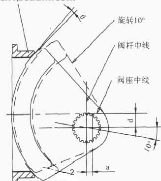 气动(电动)双偏心半球阀(图1)的半球体采用双偏心设计,密封效果可靠,瞬间脱开,力矩小,使用寿命长。可应用在输送颗粒类介质的苛刻工况中。其结构原理是半球体(图2)中线与阀杆中线偏置尺寸a,与阀座中线偏置尺寸b,全开时球体与阀座完全脱开,并有一定的间隙,回转半径分为长半径和短半径,在长半径转动轨迹的切线会与阀座密封面形成一个θ角,在阀门启闭时,半球相对阀座面有一个渐出脱离(如图在开度10°时,芯已经完全脱离)和渐入挤压的作用,从而降低了启闭时阀座与半球之间的机械磨损和擦伤,提高了使用寿命。