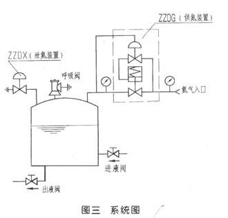 氮封阀是由ZZDG供氮阀和ZZDX型泄氮阀两大部份组成。当罐内压力升高超过设定值时,供氮阀关闭,泄氮阀打开(罐顶未设呼吸阀,或呼吸阀故障打不开),将罐内多余压力泄放。在储罐内压力降低时,泄氮阀处于关闭状态,供氮阀打开,向罐内注氮气。供氮阀阀前压力应在1.0Mpa以下,现场压力较高时,可在供氮阀前安装一只ZZYP型自力式压力调节阀将压力减至1.0 Mpa以下,以提高可靠性和使用效果。