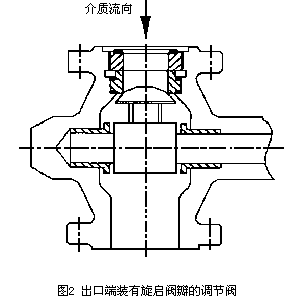 闪蒸破坏是高速度的饱和气泡冲击阀体表面,并腐蚀阀体表面造成的。由于角形阀中的介质直接流向阀体内部下游管道的中心,而不是象球形阀一样直接冲击体壁,所以大大减少了冲击阀体体壁的饱和气泡数量。从而减弱了闪蒸的破坏力。因此在闪蒸破坏出现的情况下,角形阀体设计比球形阀体更为经济。带有旋启式阀瓣的阀门结构(图2)也是一种有效的防止闪蒸破坏的方法。在阀体内部下游的一侧安装了旋启式阀瓣,液体的压力在阀体的下游处降到饱和压力以下,闪蒸出现在下游管线。在某些情况下,常常采用由一段下游管道承受闪蒸破坏的方法保护阀门。