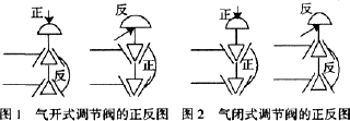 (2)气闭式调节阀。图2为气闭式调节阀的正反图,当阀门定位器给调节阀膜头发送关阀的压力信号时,如果阀杆太短,阀芯向下(或向上)移动距离不够,造成阀芯和阀座之间有间隙,而不能充分接触,导致调节阀关不严而有漏。同样,如果阀杆太长,阀杆向上(或向下)移动距离不够,而不能充分打开阀芯导致调节流量太小。