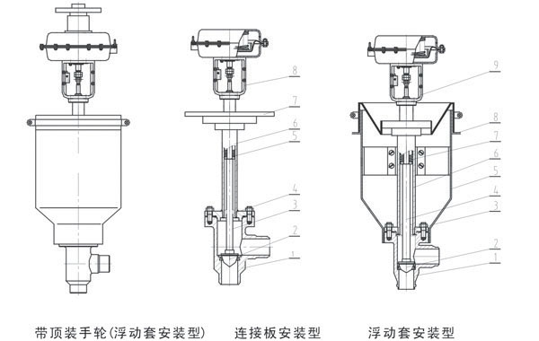 1、阀体2、阀芯3、导向套4、阀杆5、浮动套6、长颈阀盖7、波纹管8、连接板9、执行机构