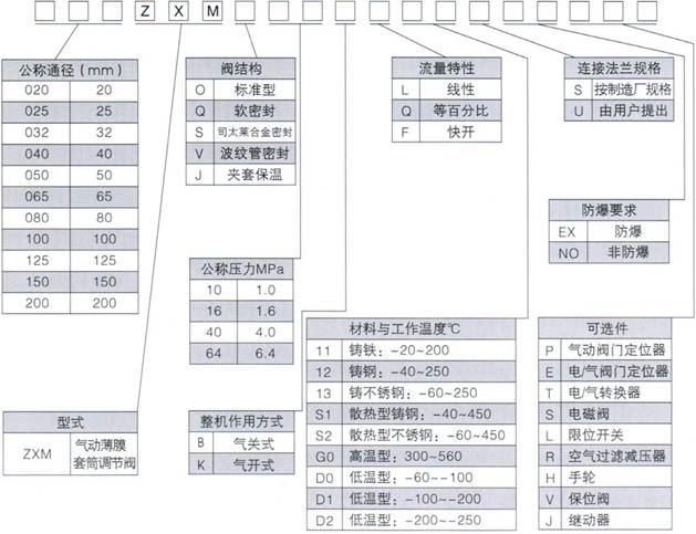 ZXM(ZJHM)精小型气动薄膜套筒调节阀系列产品有标准型和调节切断型、波纹管密封型、夹套保温型等多种品种。产品公称压力等级有PN10、16、40、64,阀体口径范围由DN20~200,适用流体温度由-200℃至+560℃,其范围内多种档次。泄漏量标准有IV级或VI级。流量特性为线性或等百分比。多种品种、规格可供选择。