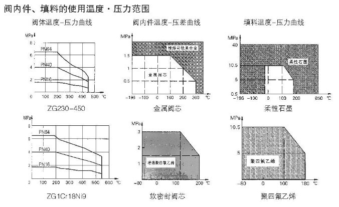 一、自力式压力调节阀的阀内件及填料的使用温度及压力范围: