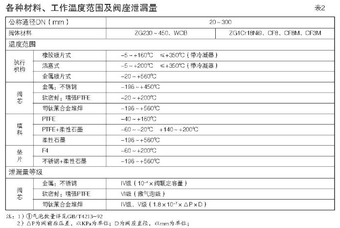 二、自力式压力调节阀的各种材料、工作温度范围及阀座泄漏量: