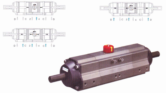 三位置气动执行器有二种型号0°-45°-90°和0°-90°-180°,在气口“2”进气后活塞向两端运动被两端设计有辅助活塞产生机械限制来实现中间位置的,可直接利用外面两端调节螺栓很容易调节中间位置角度,如20°、30°、50°、75°和95°、120°、130°、150°、175°等。