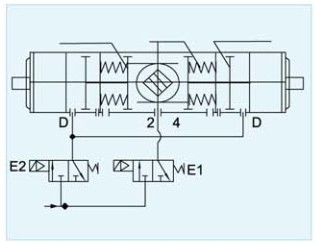 两段式气动执行器由标准气动执行器和另外两个附加的外部气缸组成,通过改变附加气缸的活塞行程,执行器和阀门转角被停止在预先设定的角度(5°至85°)。因此,阀门流量得以调节。这种装置由两个电磁阀控制。如图:E1=二位三通电磁阀(FC),控制执行器;E2=二位三通电磁阀(FO),用于控制两个外部气缸。