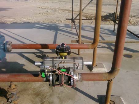 气动两段式切断球阀是油品通向鹤管的关口,需要进行精确控制,自动定量装车系统采用气动两段式切断球阀实现对油料的精确控制。该阀门安装了一个限位开关、两个电磁阀、一个球阀,通过对电磁阀的不同供电方式,实现了阀门的全开、半开、关闭等功能,同时限位开关提供开关量信号给批控仪,利用批控仪本身的通信功能将阀门状态提供给上位机,减少了线路连接,方便施工。