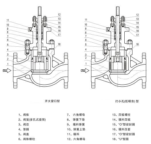 气动薄膜笼式单座调节阀阀芯有开大窗口和打小孔(低噪音型)两种,后者有降低噪声,减小共振的功能,可选为低噪音阀。该系列调节阀可制成波纹管密封型、散热片型、加长型上阀盖等特殊结构。